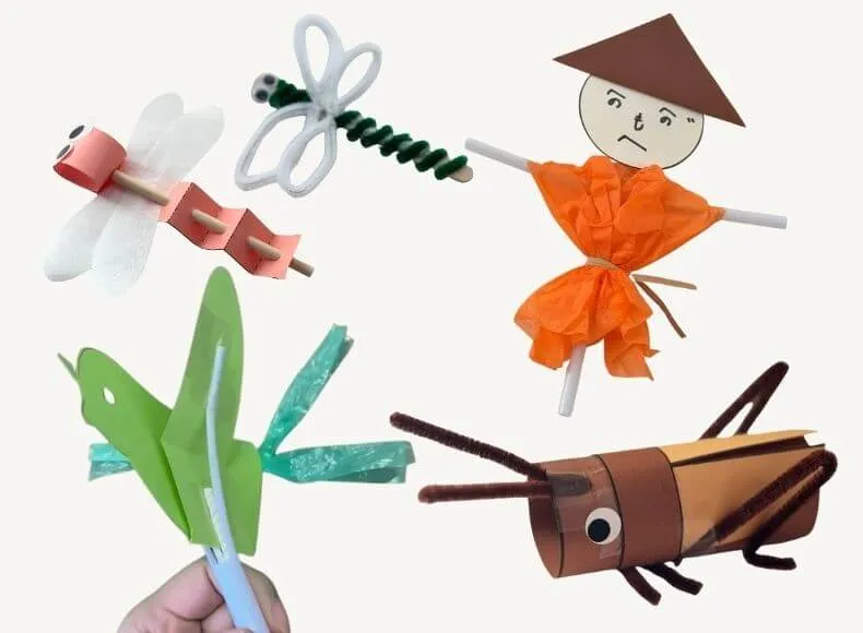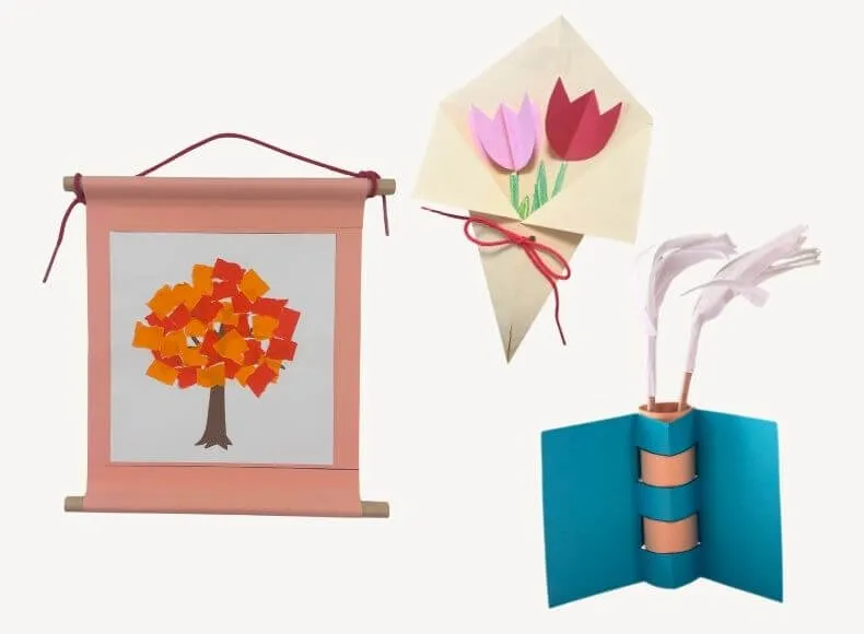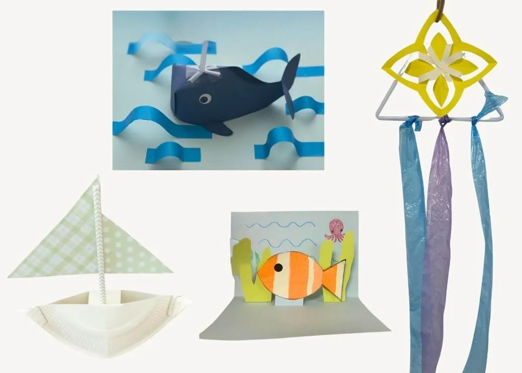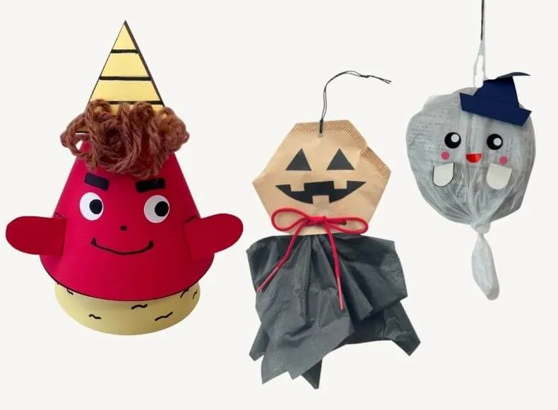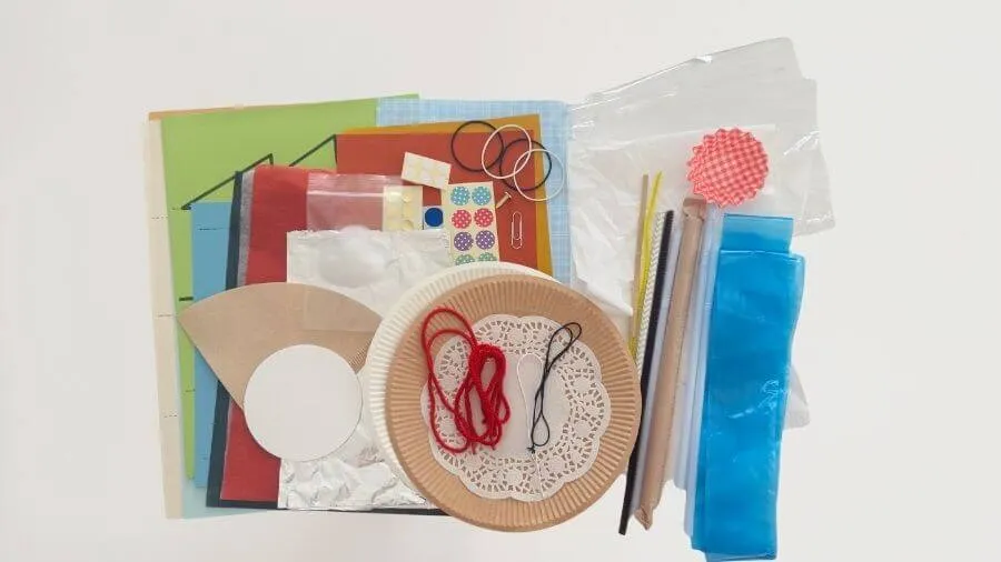 紙やモール、ストロー、紙皿だけでなく、割ピンやおかずカップ、コーヒーフィルターなど多彩な材料を使用。