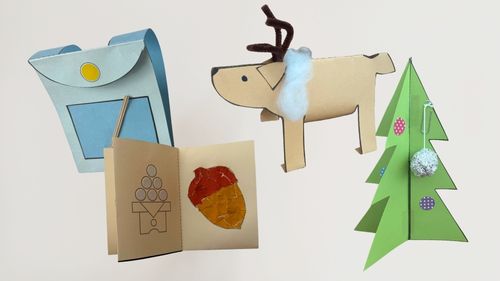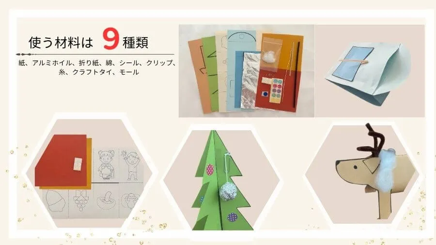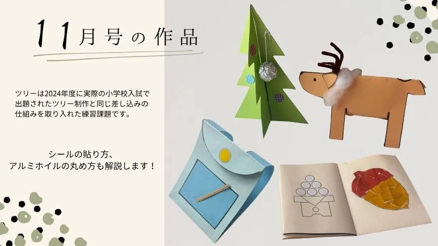 11月号では「読書の秋」「行楽の秋」をテーマに、ミニブックとリュックサックを制作。さらに12月を先取りして、クリスマスツリーとトナカイを作ります。