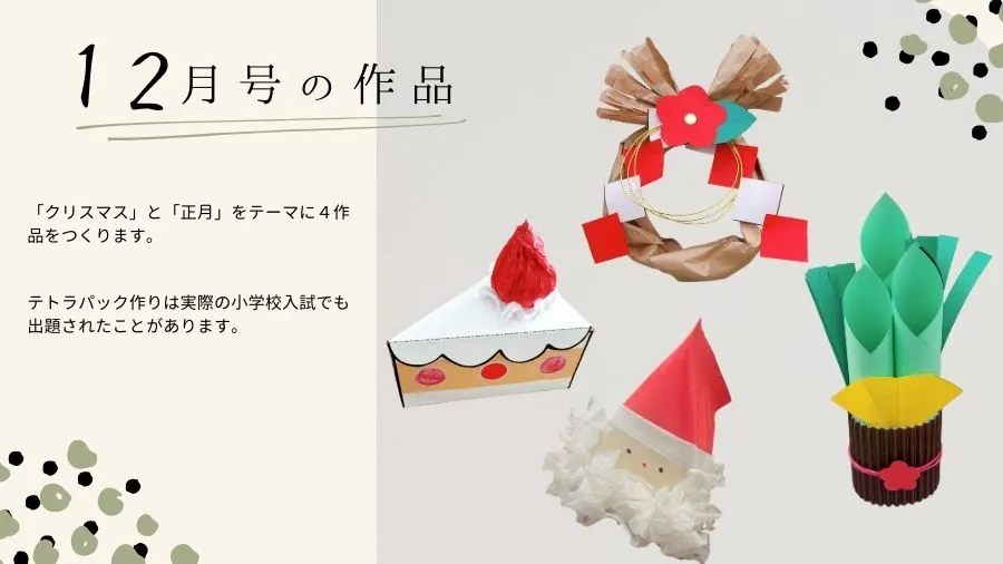今月号では、水引や段ボールシートといったご家庭では扱う機会の少ない素材に加え、実際の入試で出題された「テトラパック作り」を採用した制作課題をご用意しました。さまざまな質感の素材や工夫を凝らした技法に触れることで、より豊かな体験が積める内容になっています。