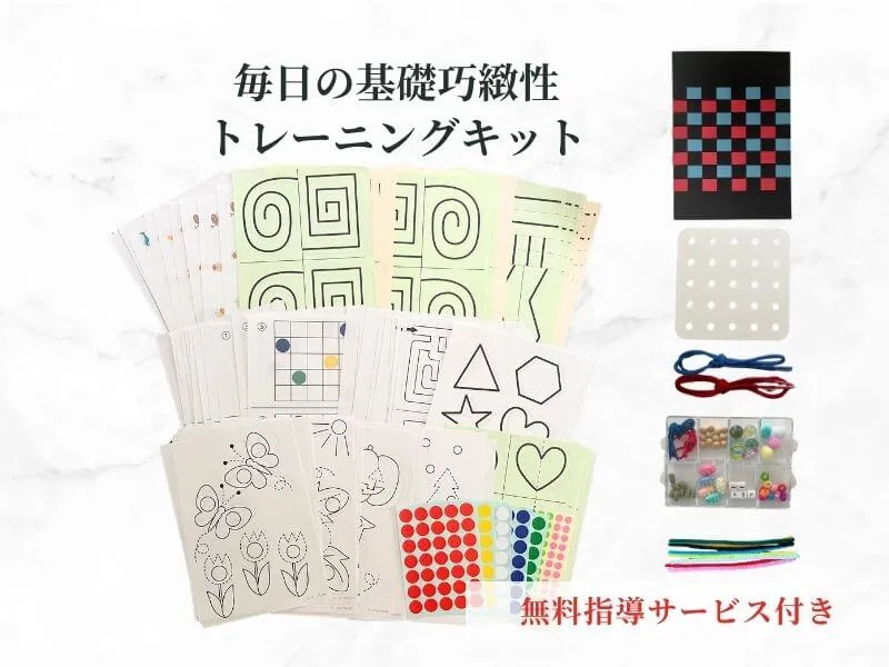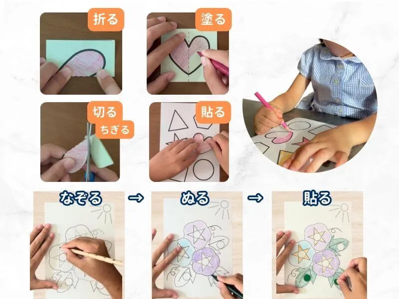 切る、ちぎる、貼る(のり・シール)、結ぶ、ねじる、運筆(なぞる・線結び・図形模写・迷路)、格子編み、ビーズ通し、箸
