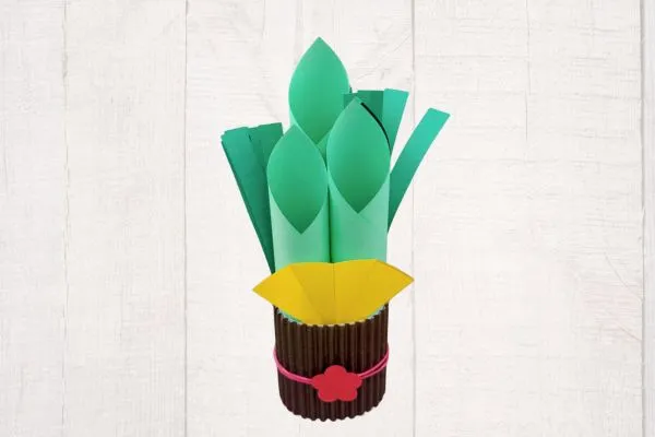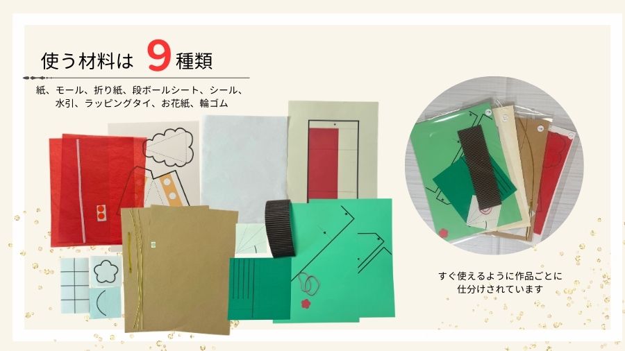 紙、ストロー、モール、お花紙、紐、シールなどの定番素材のほかに、クリップ、輪ゴム、ビニール袋、割ピン、糸、綿、スズランテープ、コーヒーフィルター、おかずカップ、紙コースター、レースペーパーなど多様な素材を取り入れています。